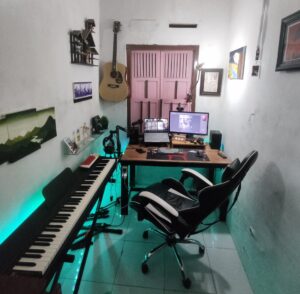 My studio is a small room filled with all the essentials for a digital creator. I use a laptop as my main setup, complemented by an additional monitor to support my editing work. There's also a piano for practicing my music. My main camera setup is a Canon M50 equipped with Canon 50mm f1.8 and Canon 70-200mm f4 lenses, along with a Viltrox adapter. I have several tripods, microphones, and studio speakers to enhance my productivity.